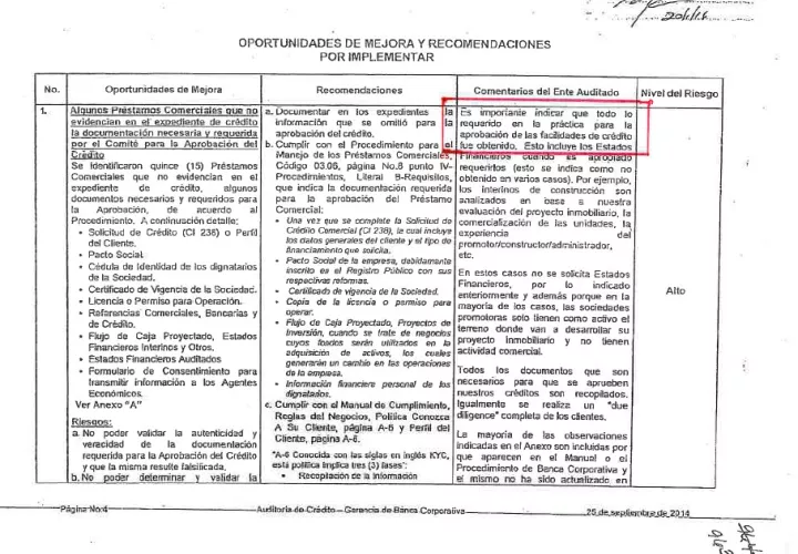 “[…] podemos concluir que nuestra auditoría [del préstamo de HPC Contratas P&V] fue catalogada con un nivel de exposición de riesgo ‘Moderado’ y la calificación general se determinó como ‘Satisfactoria’”. (f. 961)