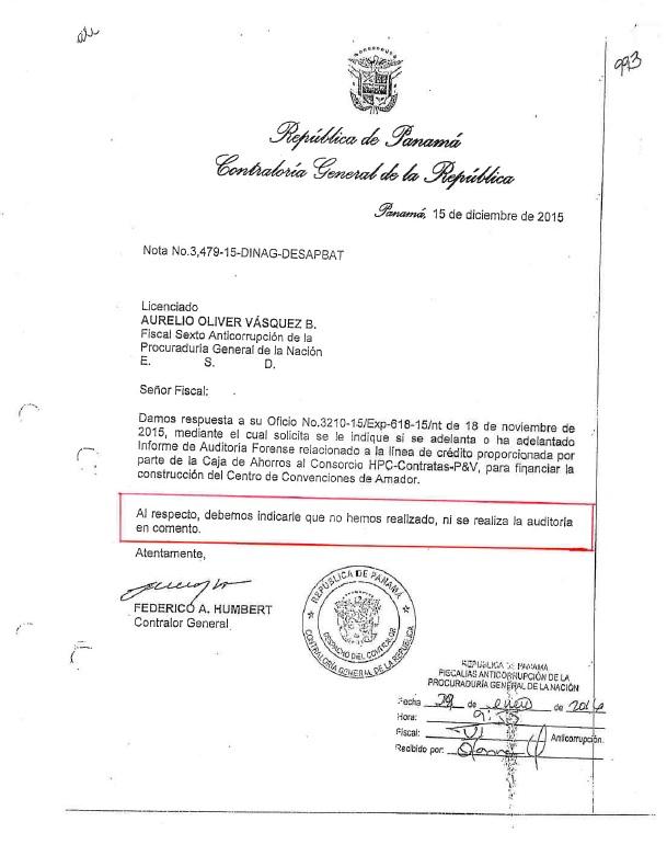 Para intentar obtener la única prueba idónea sobre la existencia de una lesión patrimonial al Estado, la fiscalía remitió tres (3) oficios al contralor Federico Humbert preguntando “si realiza o si ha realizado un Informe de Auditoría Forense relacionada a la línea de crédito de la Caja de Ahorros al Consorcio HPC-Contratas-P&V”.