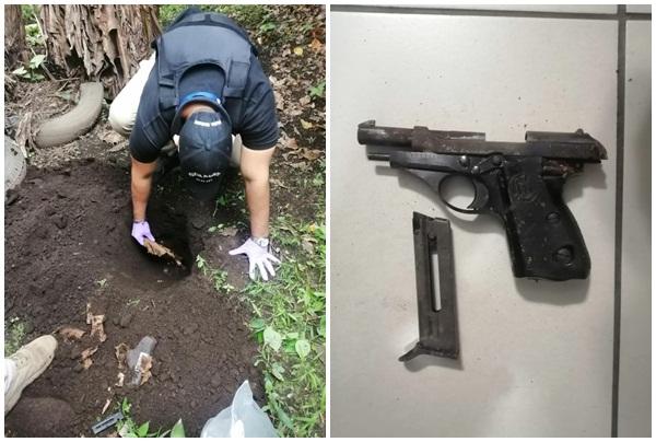 Un arma de fuego calibre 22 con su cargador con 4 municiones y un casquillo fue encontrada enterrada en el patio de una residencia que fue allanada por la Policia Nacional y funcionarios del Ministerio Público en la barriada El Rocio en el distrito de David, en la provincia de Chiriquí.