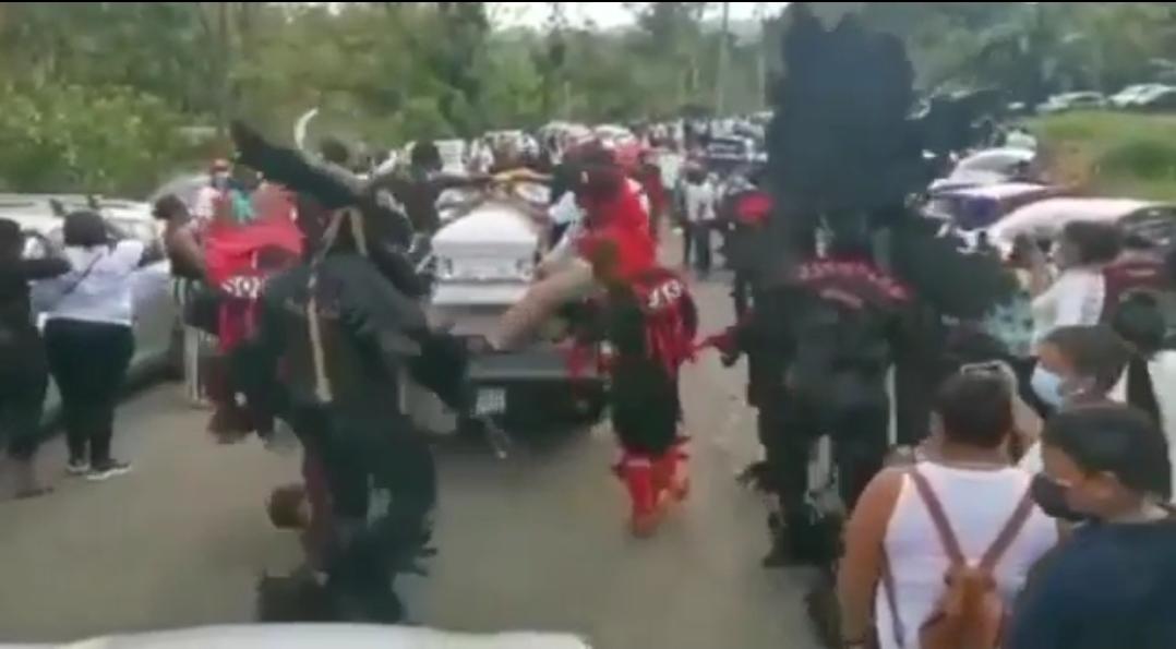 Integrantes de una banda independiente resonaban los tambores en honor al difunto . Los diablitos con sus bailes resguardaba el ataúd y familiares y amigos sin guardar distancia y muchos sin mascarillas caminaban hacia el camposanto para sepultarlo.
