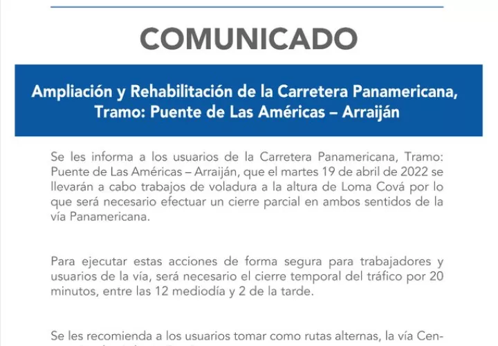 Panamá- El próximo martes ,19 de abril, el Ministerio de Obras Públicas (MOP), realizará trabajos de voladura a la altura en Loma Cová, como parte del proyecto de ampliación y rehabilitación de la carretera Panamericana, tramo Puente de Las Américas-Arraiján.