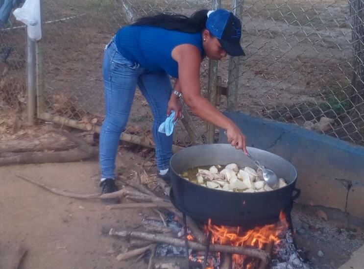 Cocinan sancocho "Gallo Tapa'o " en la entrada de la escuela