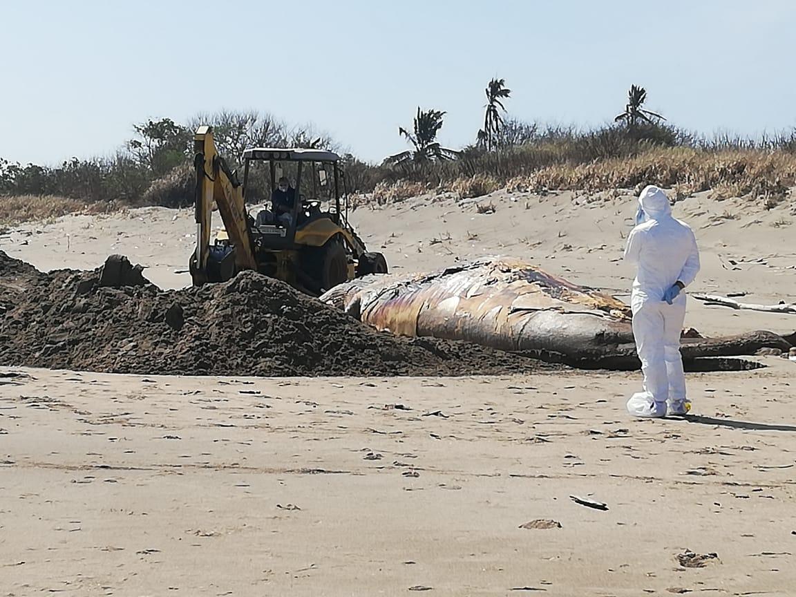 Apoyados con una retroexcavadora del Ministerio de Obras Públicas, los funcionarios enterraron al animal de más de cinco metros, en la misma área donde fue arrastrada por las olas.