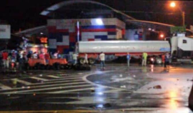Tras los enfrentamientos entre manifestantes y transportistas dividimos por el cierre de la frontera de Paso Canoas entre Panamá y Costa Rica, la noche de este martes fue aprovechada por quienes están a favor del cierre para atravesar un camión articulado , tipo cisterna , justo en la entrada de ambas naciones cerca a la Aduanas panameña.