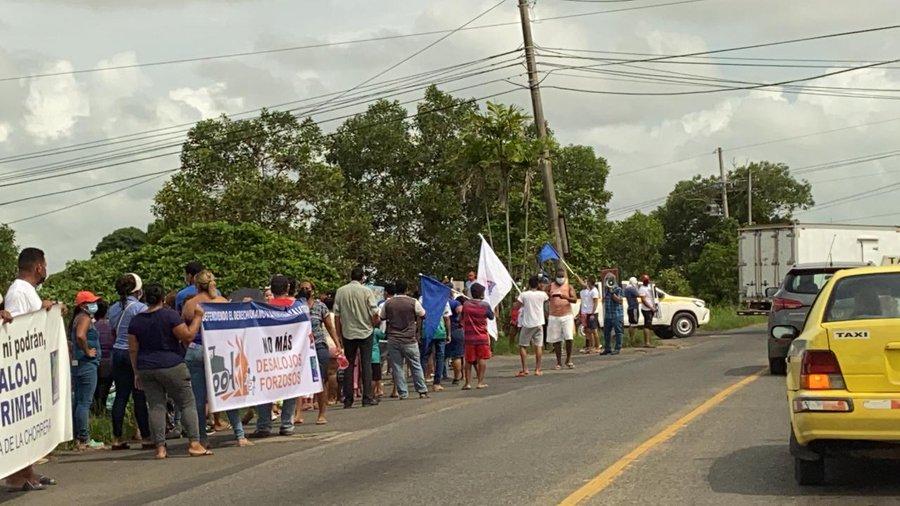 Un grupo de familias precaristas protestan hoy, viernes, a orilla de la vía de Puerto Caimito, La Chorrera, tras la orden de desalojo emitida por las autoridades locales.
