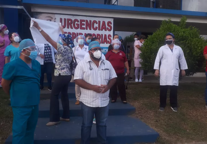 Un grupo de médicos, enfermeras y otros funcionarios de atención a personas contagiados de Covid 19 de la Policlínica Horacio Díaz Gómez de la Caja de Seguro Social realizaron una protesta la tarde de el jueves en las fuera de las instalaciones molestos porque según ellos, no fueron tomados en cuenta para recibir en la primera fase la vacuna contra el mortal virus.
