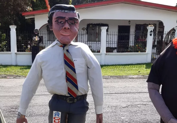 Alvarez, optó por un muñeco del exmandatario Ricardo Martinelli llevando sobre el pecho un teléfono público en alusión a las llamadas que éste realizaba durante su detención en la cárcel de El Renacer.