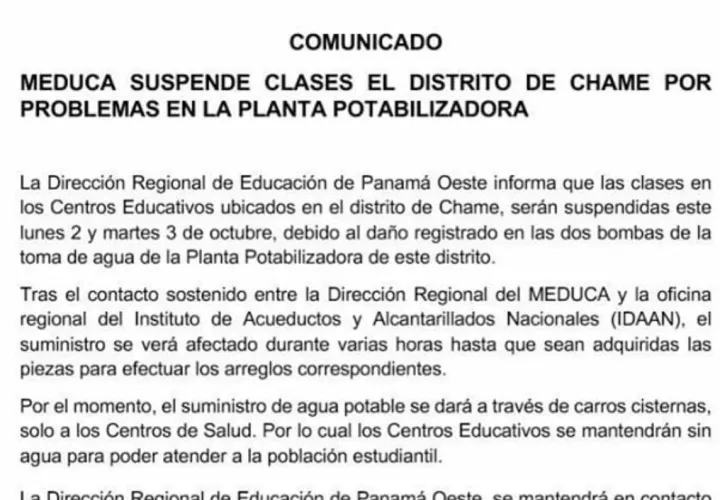 El Ministerio de Educación (Meduca), a través de un comunicado de prensa, informa que el lunes y martes ( 2 y 3 de octubre) se suspenderán clases en centros educativos del distrito de Chame.
