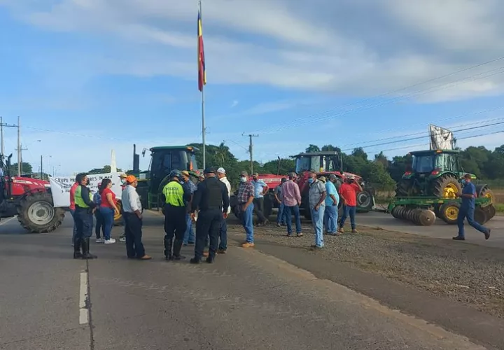 Panamá- Un grupo de productores de maíz junto con sus tractores y herramientas protestan y mantienen el cierre de la vía sobre el puente del río La Villa de Los Santos, en la mañana de hoy, miércoles.