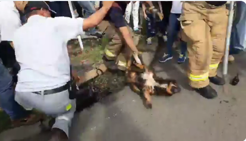 El video capta cómo los camisas rojas realizan las labores para extraer al canino de la alcantarilla, que luego de salir sano y salvo corrió por la calle.