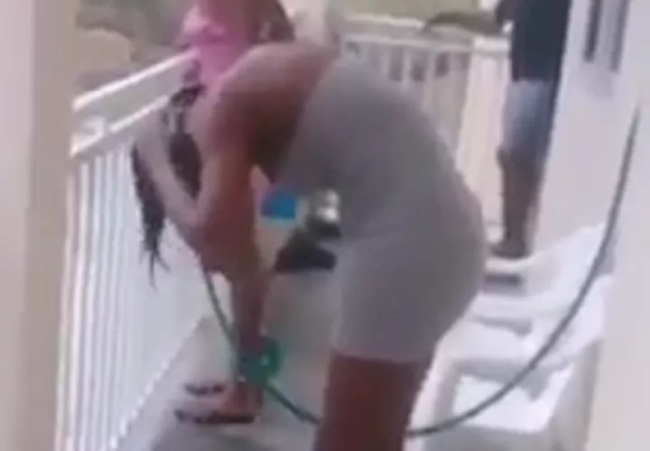 Un video capta cómo una dama debe hacer para lavarse la cabeza y bañarse en la parte exterior del apartamento.