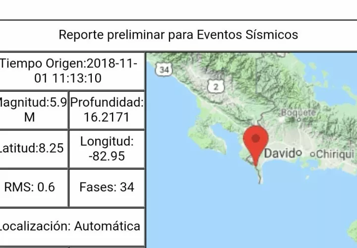 Panamá- Hoy, jueves, a las 6:13 a.m. se registró un sismo de 5.9 Mw, localizado en el distrito de Puerto Armuelles, provincia de Chiriquí con una profundidad de 16.22Km.