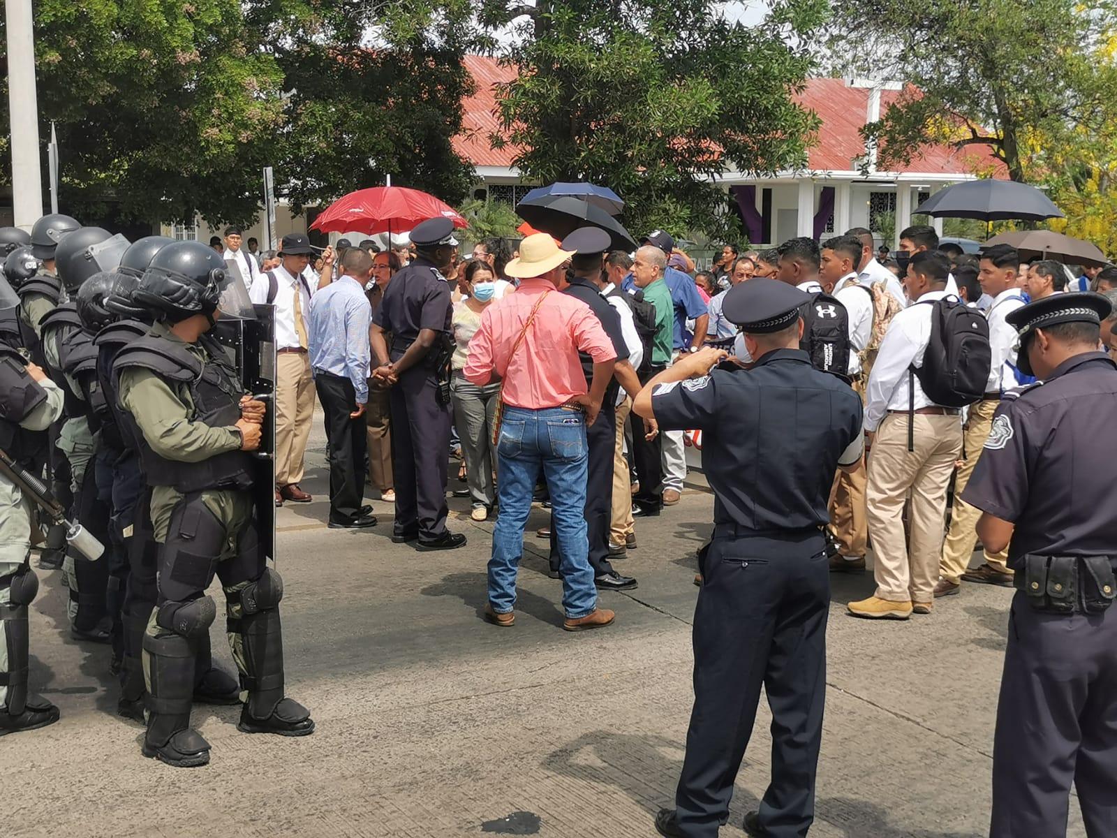 Después del acto cívico del día lunes, los padres de familia presentes salieron en una manifestación con estudiantes y docentes hasta los predios de la vía Interamericana, donde fueron interceptados por unidades de Control de Multitudes de la Policía Nacional.