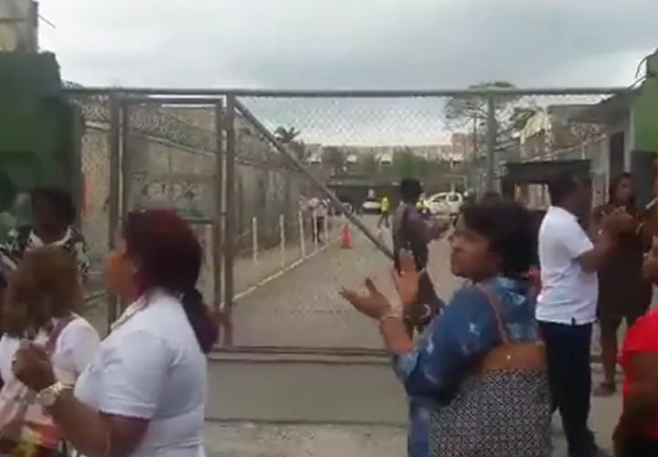 Docentes y padres de familia del centro educativo San Vicente de Paul protestan hoy en la parte exterior de las oficinas de la empresa encargada del proyecto Renovación Urbana en la ciudad de Colón.
