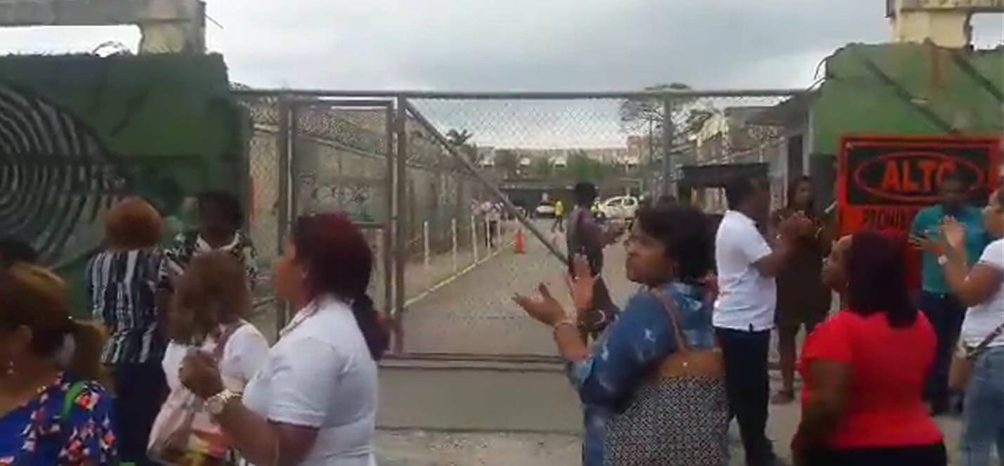 Docentes y padres de familia del centro educativo San Vicente de Paul protestan hoy en la parte exterior de las oficinas de la empresa encargada del proyecto Renovación Urbana en la ciudad de Colón.