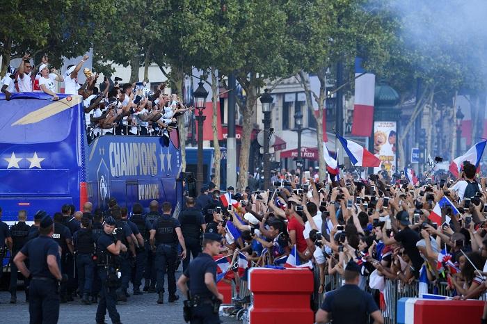 Signo de los tiempos que corren, en los que la seguridad ha cobrado un espacio cada día más importante, sobre todo en un país machacado por el terrorismo, el paseo en autobús descapotable lo hicieron los "bleus" de hoy alejados de los hinchas, separados por un impresionante despliegue policial, contraste con sus predecesores, que navegaron entre miles de personas que pudieron tocarles con sus propias manos.