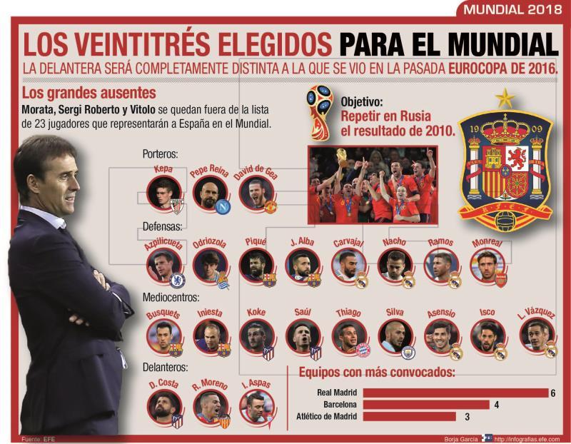 Nacho Monreal, defensa del Arsenal, entró definitivamente en la lista de 23 convocados por Julen Lopetegui, seleccionador español, para el Mundial de Rusia 2018, en la que no entran dos jugadores que participaron activamente en la previa como Álvaro Morata (Chelsea) y Víctor Machín 'Vitolo' (Atlético de Madrid).
