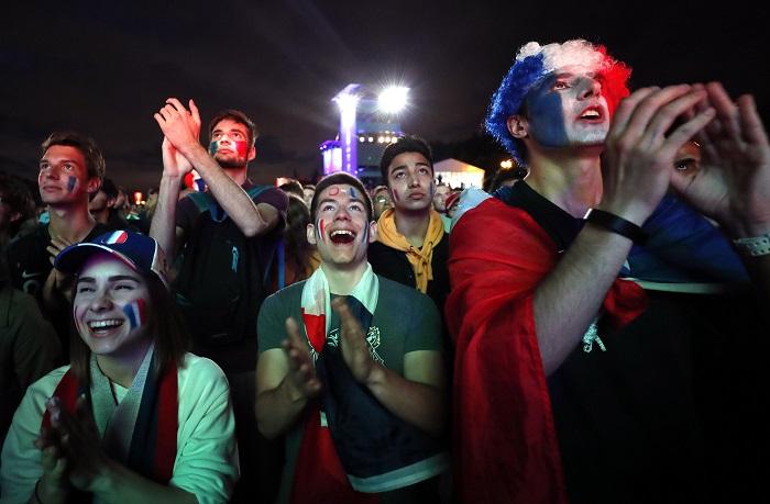 "On est en final!" ("¡Estamos en la final!", exclamaron los aficionados, mientras se abrazaban, mandaban mensajes a sus familias o se movían frenéticamente. Todo bajo el intenso olor a pólvora y los destellos de bengalas que se encendieron al término de las semifinales.