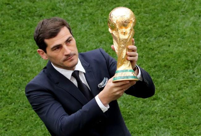 Casillas, campeón mundial en 2010 y que estuvo acompañado por la modelo rusa Natalia Vodiónova, levantó la copa que será alzada por el equipo que gane la final que se disputará en este mismo estadio el 15 de julio.