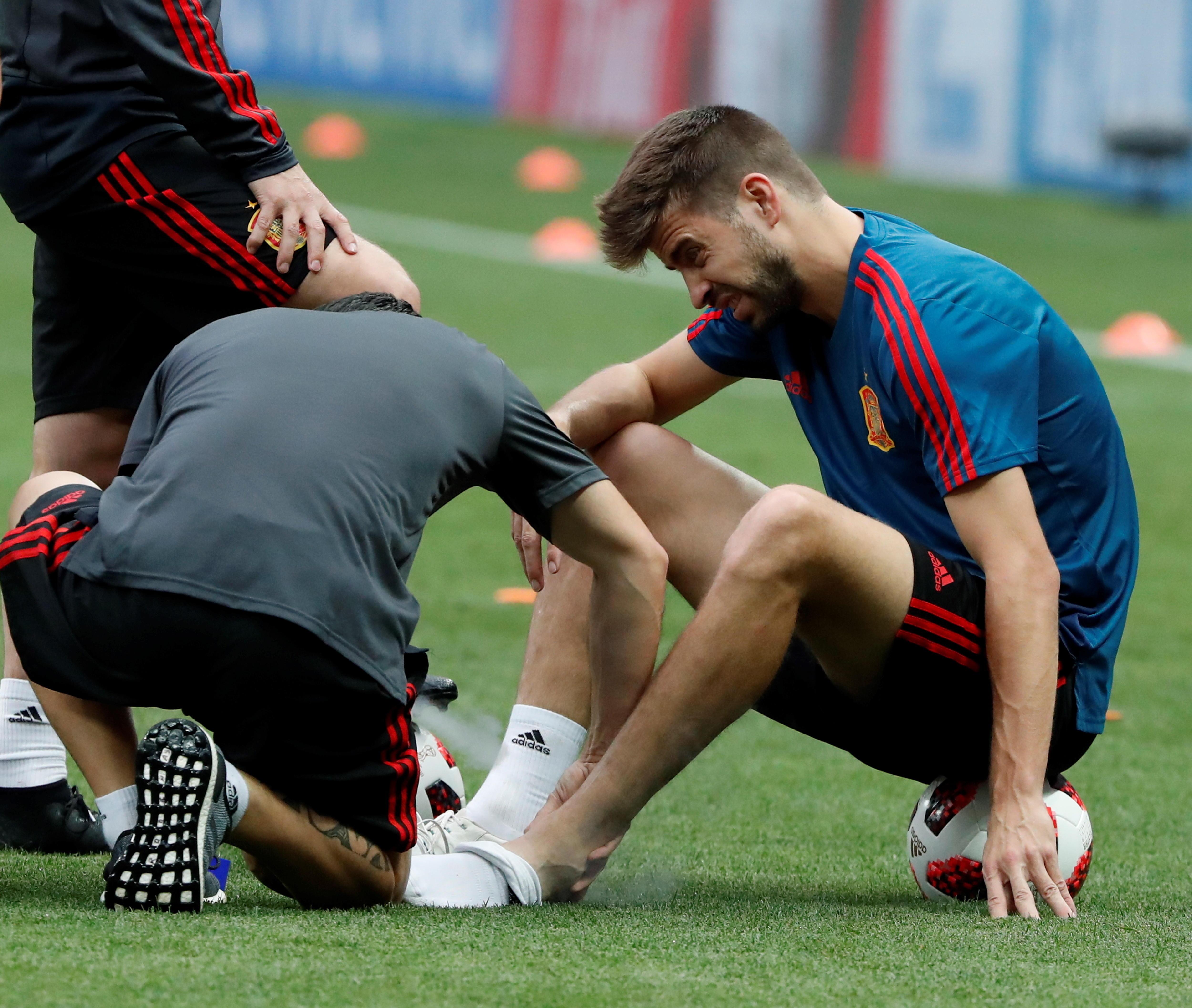 Gerard Piqué recibió en el rondo de inicio del último entrenamiento antes de los octavos de final del Mundial 2018, un golpe de Pepe Reina en su tobillo izquierdo, que provocó que fuese atendido por los médicos de la selección por un corte.
