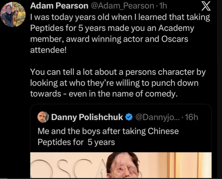 El famoso actor británico Adam Pearson respondió a un comentario del comediante Danny Polishchuk, quien realizó burlas sobre su apariencia tras su participación en los premios Oscar 2026.