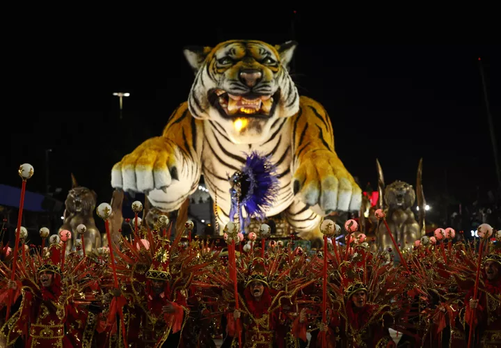 Dividida en 22 alas, cada una con disfraces diferentes, la escuela exhibió en el sambódromo seis enormes carrozas alegóricas.