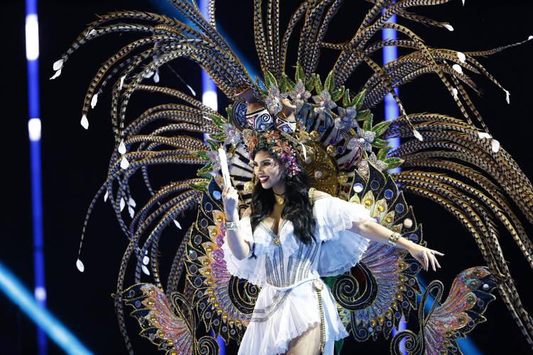 La Miss Universe Panamá, Natasha Vargas, desfiló hoy durante la gala de traje típico con la alegoría del traje enfocado en el tambor de la alegría.
