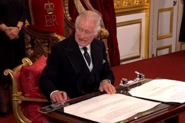 El desprecio en su trato a subordinados el día de la firma de su proclamación, hoy se suma que el nuevo monarca británico ha vuelto peder los nervios en público al mancharse los dedos con una pluma en otra firma.