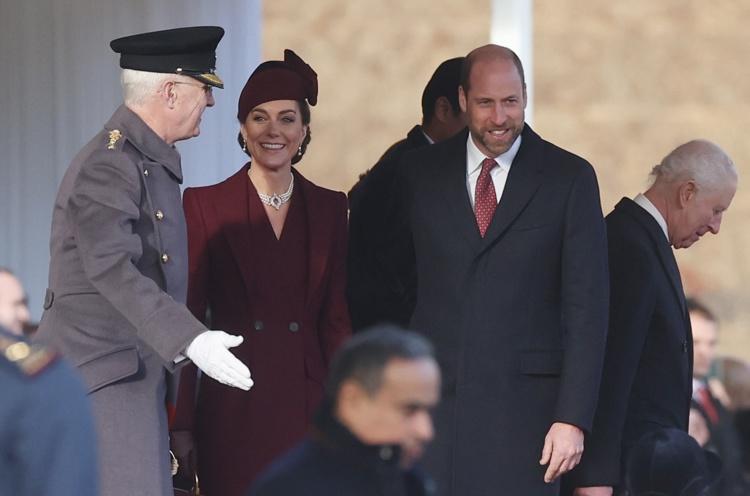 Como manda la tradición, Guillermo y Catalina, esta última con aspecto relajado tras haber terminado el pasado septiembre su tratamiento de un cáncer no divulgado, acompañaron al emir y su esposa desde su residencia privada hasta el lugar donde se celebró el desfile militar.