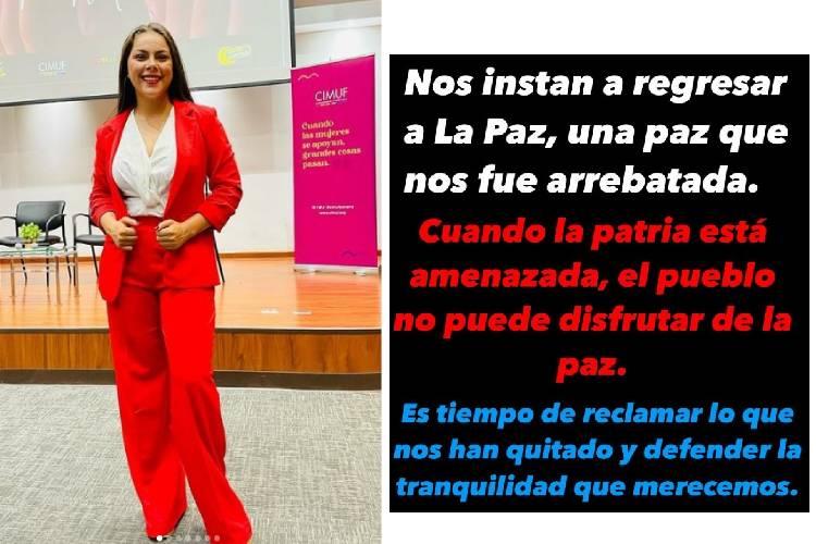 "Nos instan a regresar a la paz, una paz que nos fue arrebatada. Cuando la patria está amenazada, el pueblo no puede disfrutar de la paz. Es tiempo de reclamar lo que nos han quitado y defender la tranquilidad que merecemos', aseguró al escuchar las declaraciones de políticos del Gobierno", detalla.