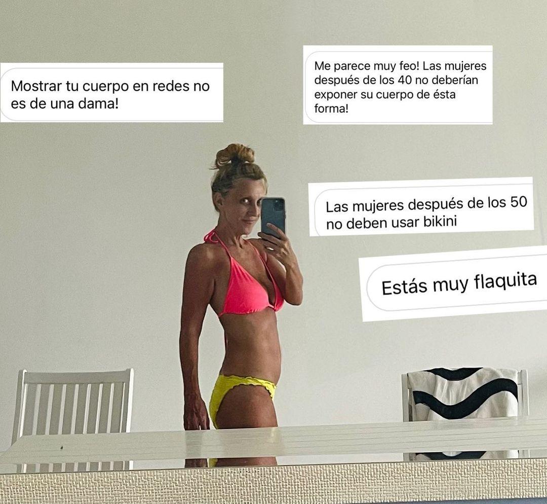 “Mostrar tu cuerpo en redes no es de una dama”, “Me parece muy feo, las mujeres después de los 40 no deberían exponer su cuerpo de esta forma”, “Las mujeres después de los 50 no deben usar bikini”, “Estás muy flaquita”, fueron los mensajes que le llegaron.