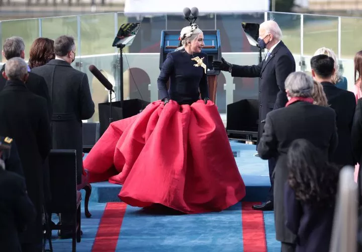 Lady Gaga, que interpretó el himno nacional durante la investidura, lució un espectacular diseño de Maison Schiaparelli, creado por Daniel Roseberry. La cantante llevaba una chaqueta entallada de cachemir azul marino con un broche dorado de la paloma de la paz y una falda de seda roja. Ha completado el conjunto con guantes negros y el cabello recogidos con dos trenzas a moda de diadema.