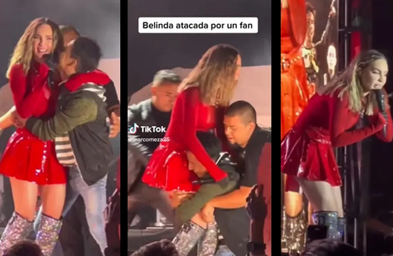 La cantante Belinda se llevó tremendo momento de temor, esto luego de que un fan se subiera al escenario para abrazarla y por poco la tirara. Aunque la cantante lo manejó con tranquilidad, la realidad es que el joven la dejó un poco lastimada.