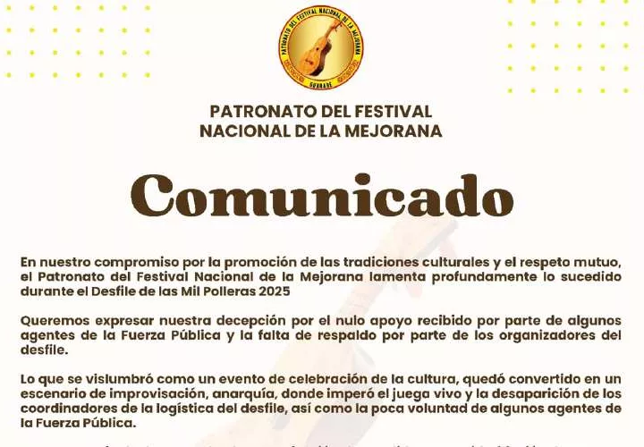 “El Patronato del Festival Nacional de la Mejorana lamenta profundamente lo sucedido durante el Desfile de las Mil Polleras 2025. Queremos expresar nuestra decepción por el nulo apoyo recibido por parte de algunos agentes de la Fuerza Pública y la falta de respaldo por parte de los organizadores del desfile. Lo que se vislumbró como un evento de celebración de la cultura, quedó convertido en un escenario de improvisación, anarquía, donde imperó el juega vivo y la desaparición de los coordinadores de la logística del desfile, así como la poca voluntad de algunos agentes de la Fuerza Pública. Este escenario de descontrol y desorganización desmedida provocó la fricción de nuestra delegación con otros grupos, al punto de recibir insultos y agresiones muy lamentables”, aseguran en el comunicado.