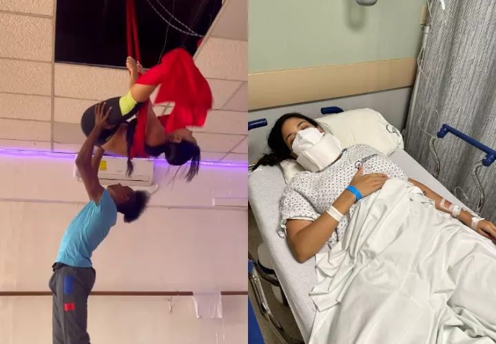 La presentadora, cantante y bailarina Marigaby contó que se fue a la porra mientras practicaba danza aérea y tuvo que ser llevada a un centro médico.
