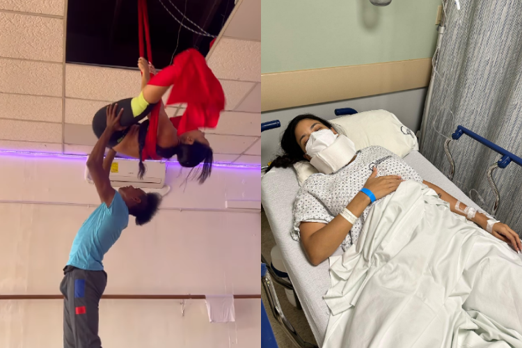 La presentadora, cantante y bailarina Marigaby contó que se fue a la porra mientras practicaba danza aérea y tuvo que ser llevada a un centro médico.