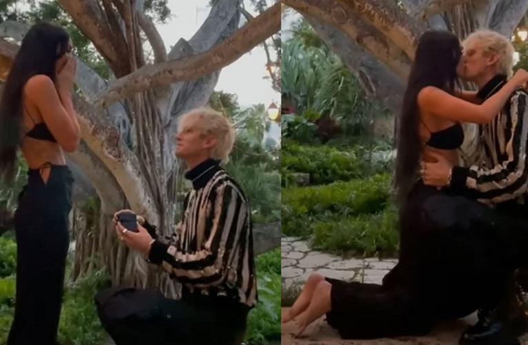 En el tope de unas escaleras, enmarcados por un árbol y amenizados por el "cantar del coquí" (anfibio nativo de la isla similar a una pequeña rana), Machine Gun Kelly se puso de rodillas y abrió la pequeña caja que contenía el anillo.