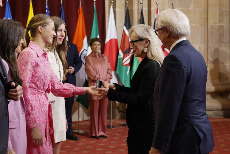 La actriz estadounidense Meryl Streep recibió este viernes de manos de la princesa Leonor de España la insignia como galardonada con el Premio Princesa de Asturias de las Artes, en un acto previo a la entrega de los galardones en el Teatro Campoamor de la ciudad española de Oviedo (norte).