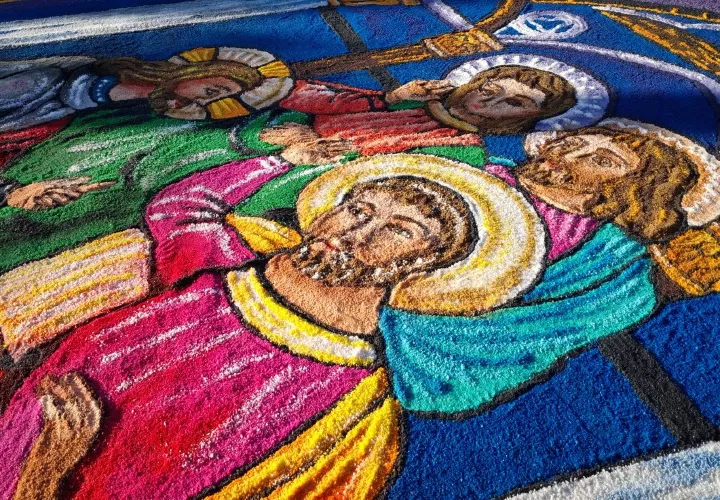 En los alrededores del parque, vistosas alfombras confeccionadas con sal teñida, y otros elementos como granos y capullos de maíz, esperaban el paso de la procesión del Santísimo Sacramento, única vez en el año en que el sagrario sale del templo.