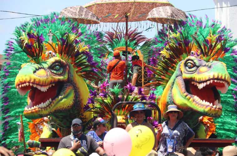 La muñeca de porcelana, como es llamada la reina de Calle Abajo de Las Tablas 2020, Grace Marlene Cano, se paseó por las calles con su carro alegórico cargado de fantasía prehistórica por varias horas.