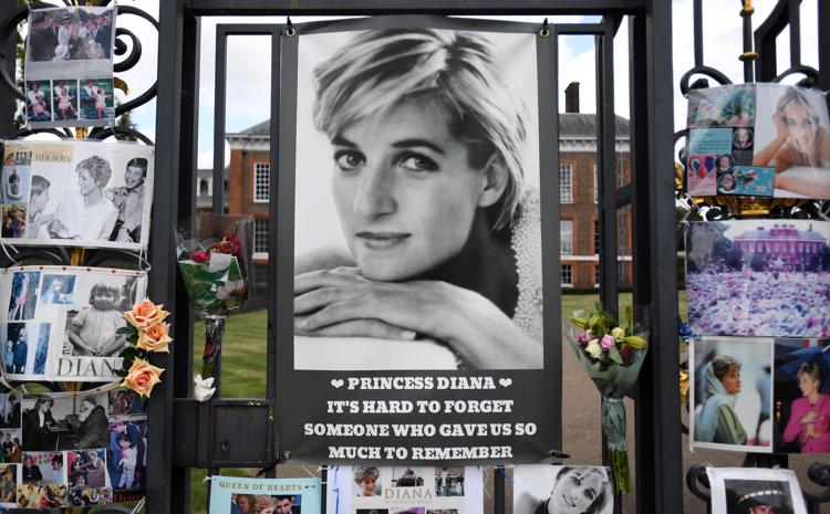 La reja del palacio de Kensington, la que fuera la residencia londinense de la princesa, está hoy decorada con una gran pancarta con fotos de Diana, flores, una bandera británica y también un adorno floral en blanco y rosa que dice: "Princesa Diana".