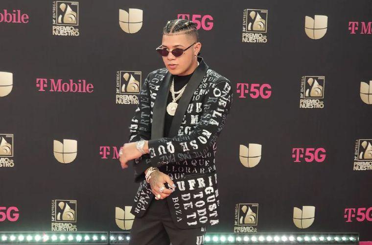 Vestido con un traje negro de la marca Christian Dior, en el cual estaban las letras de sus canciones más pegadas, Humberto Ceballos, nombre de pila de Boza, posó en la alfombra magenta de los premios Lo Nuestro, en el FTX Arena de Miami, Florida.