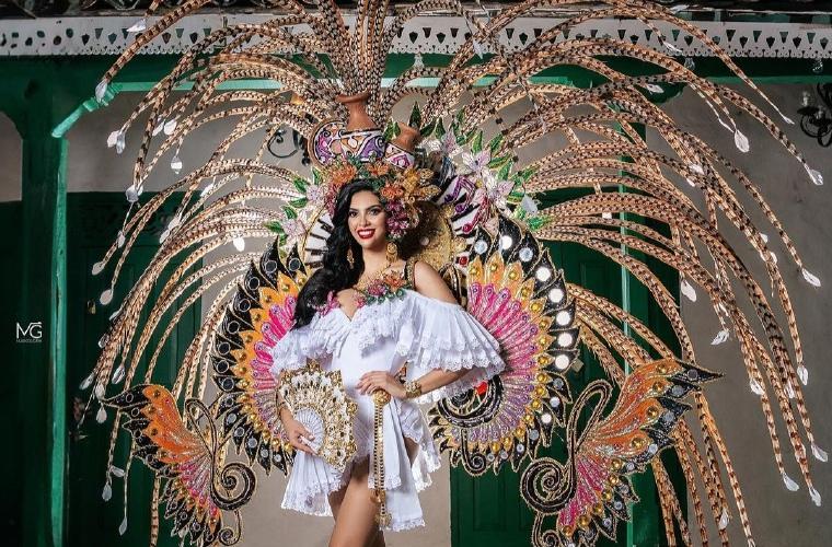 "Ella simboliza la felicidad, la alegría y la diversidad cultural del panameño. Su traje de fantasía está cargado de hermosos detalles, llenos de brillo y color. Entre los que sobresalen una estilización de la Pollera en color blanco con cristales y en su cuello, una prenda de oro perteneciente a su abuela", añadió.