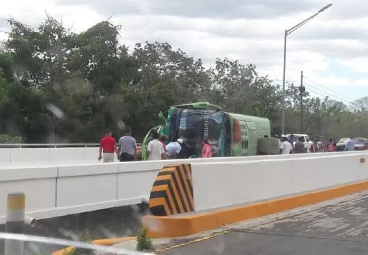 El hecho se dio cuando chofer del colectivo de color verde que viajaba en el trayecto hacia la ciudad de Chitré, chocó de frente con uno de los barandales del puente que marca el límite entre las provincias de Herrera y Veraguas y se volcó en medio de los dos paños del mismo.