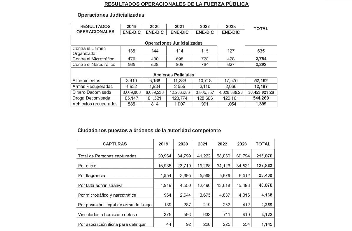 El ministro explicó que de los 508 homicidos dolosos registrados en el 2023, se dio con la aprehensión de 412 personas, entre ellos 28 menores pertenecientes a grupos delictivos; 305 adultos que corresponde a hechos reportados en el 2023 y 107 adultos más por casos perpertrados en otros años.
