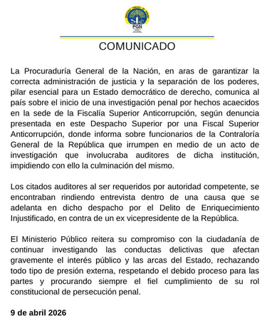 El comunicado detalla que, durante esa diligencia, funcionarios de la Contraloría habrían irrumpido en el lugar, lo que provocó la interrupción del acto que se desarrollaba en la sede anticorrupción. Este hecho motivó la apertura de la investigación penal para esclarecer lo ocurrido.