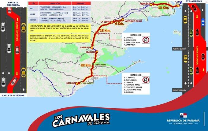 Viernes 21 de febrero: La inversión de carriles inicia a las 3:00 p.m. desde el Puente de las Américas hasta Arraiján (con 13 km.). Inicia con tres carriles desde el puente y luego se convierte en 4 carriles desde la antigua base de Howard hasta Arraiján Cabecera.