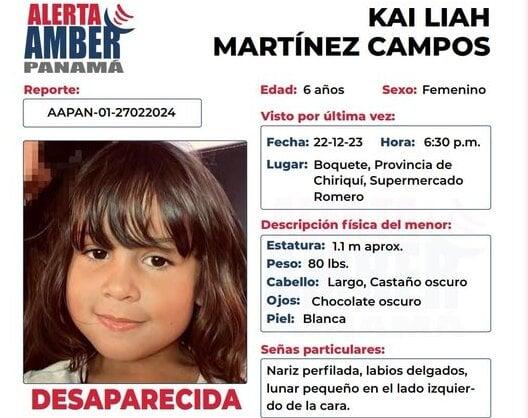 La menor de 6 años, fue vista por última vez el 22 de diciembre de 2023, alrededor de las 6:30 de la tarde en las cercanías del supermercado Romero, en Bajo Boquete, distrito de Boquete, provincia de Chiriquí.