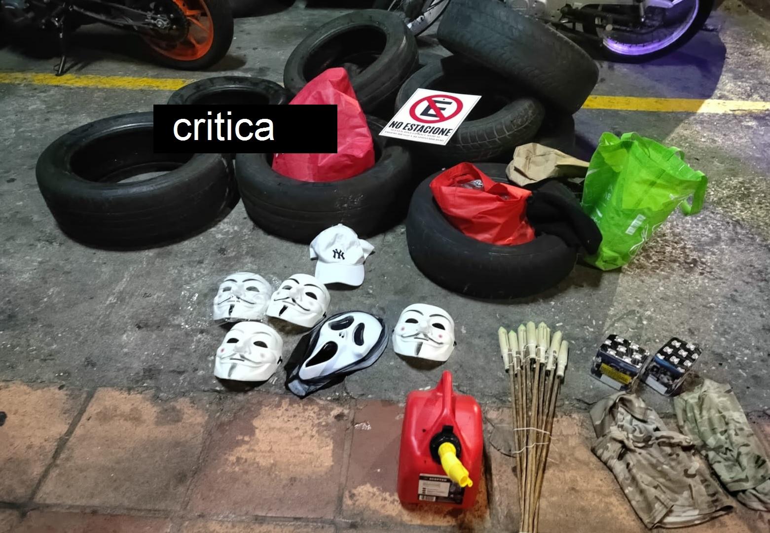 Entre los elementos confiscados se encontraban fuegos artificiales, gasolina, máscaras y nueve llantas, lo que suscita preocupación sobre su posible uso en manifestaciones y disturbios en la zona.