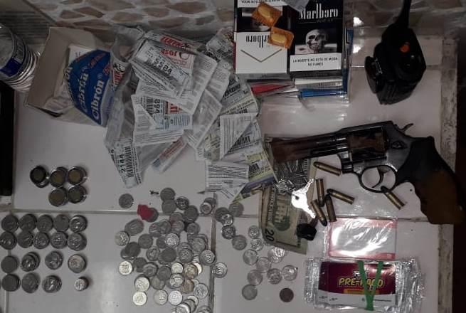 A los aprehendidos se les decomisó un arma de fuego y dinero en efectivo, tarjetas de celulares, billetes y chances de la Lotería Nacional de Beneficencia, cajetillas de cigarrillos y otras evidencias del delito.